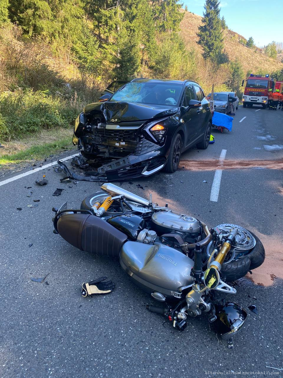 Am 03.10.2025 wurden die Feuerwehren Altenau und Clausthal-Zellerfeld gemeinsam mit dem Rettungsdienst und der Polizei zu einem Verkehrsunfall auf die K38 im Bereich Hellertal alarmiert.
